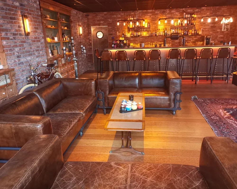 Stijlvolle loungebar met leren banken, houten vloer, vintage fiets en sfeerverlichting in een warme, industriële setting.