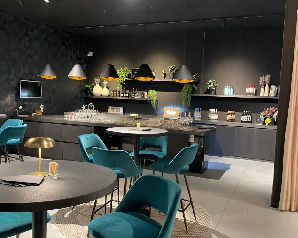 Moderne bar met turquoise stoelen, hanglampen en een donkere inrichting, met glazen en drankflessen op de toonbank.