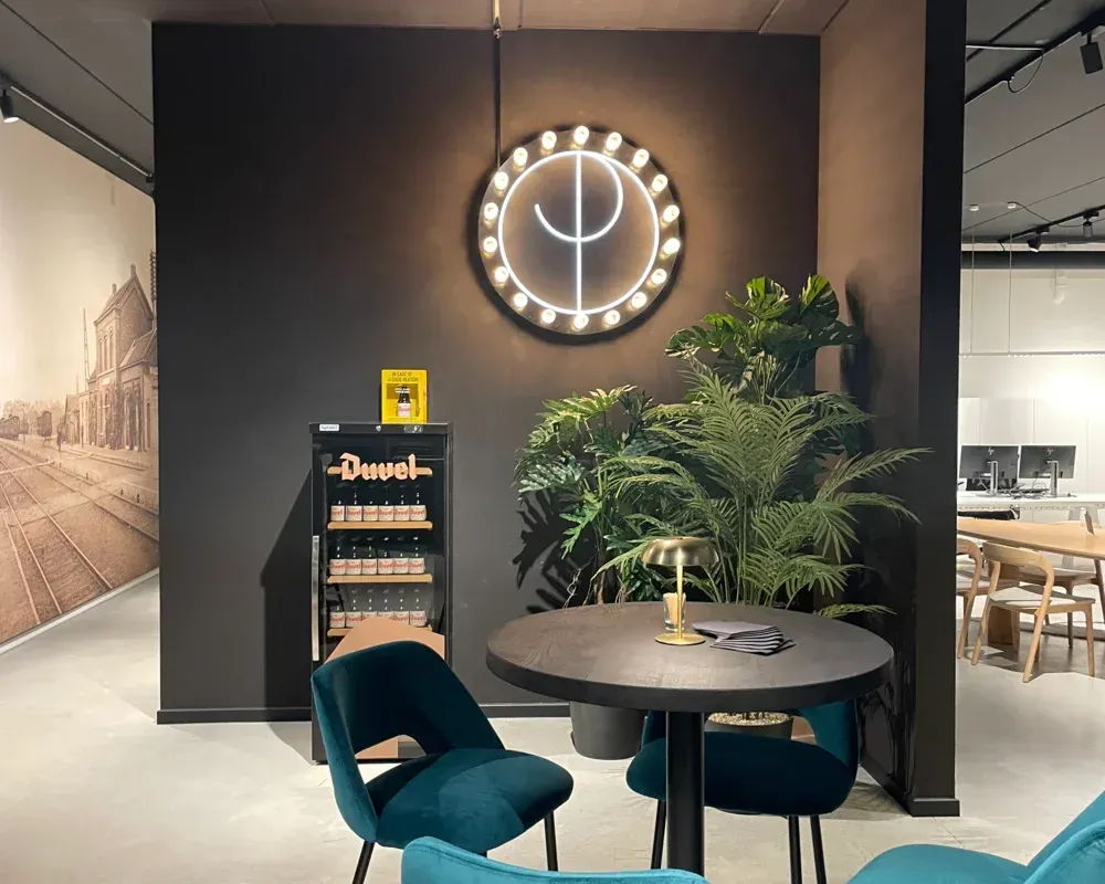 Moderne zithoek met ronde tafel, blauwe stoelen, planten en een verlichte wanddecoratie in een kantooromgeving.
