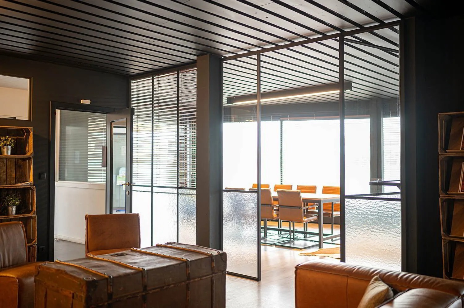 Moderne vergaderruimte met glazen wanden, leren fauteuils en houten boekenplanken in een stijlvol kantoorinterieur.