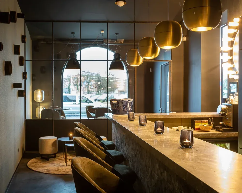 Stijlvolle moderne bar met hanglampen, marmeren toonbank en comfortabele stoelen, ideaal voor een ontspannen avond.
