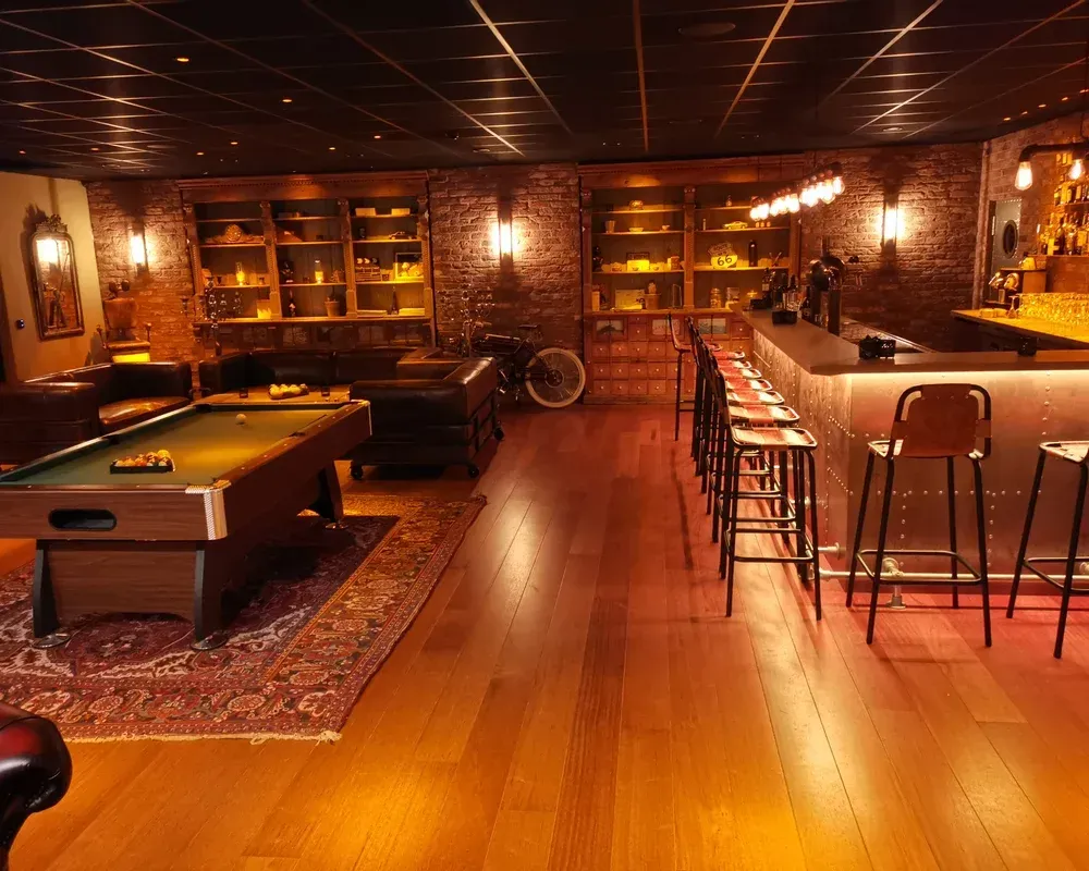 Sfeervolle bar met pooltafel, leren banken, houten vloer, bakstenen muren en verlichting voor een gezellige sfeer.