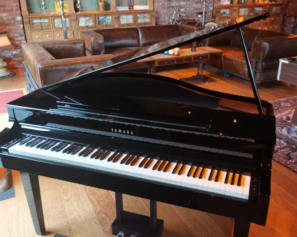 Zwarte Yamaha vleugelpiano in een warm ingerichte woonkamer met leren banken en houten vloer.