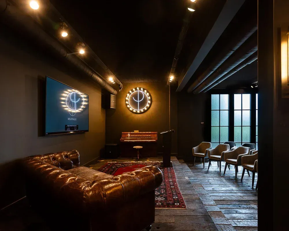Stijlvolle vergaderruimte met leren sofa, televisie, piano, en moderne verlichting in donker interieur